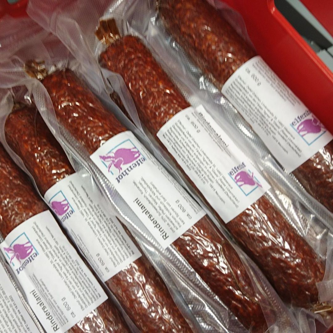 Die Wurst wird von einer lokalen Fleischerei nach alten Familienrezepten hergestellt. So bleibt das traditionelle Handwerk erhalten, und wir freuen uns über richtig gute Produkte!